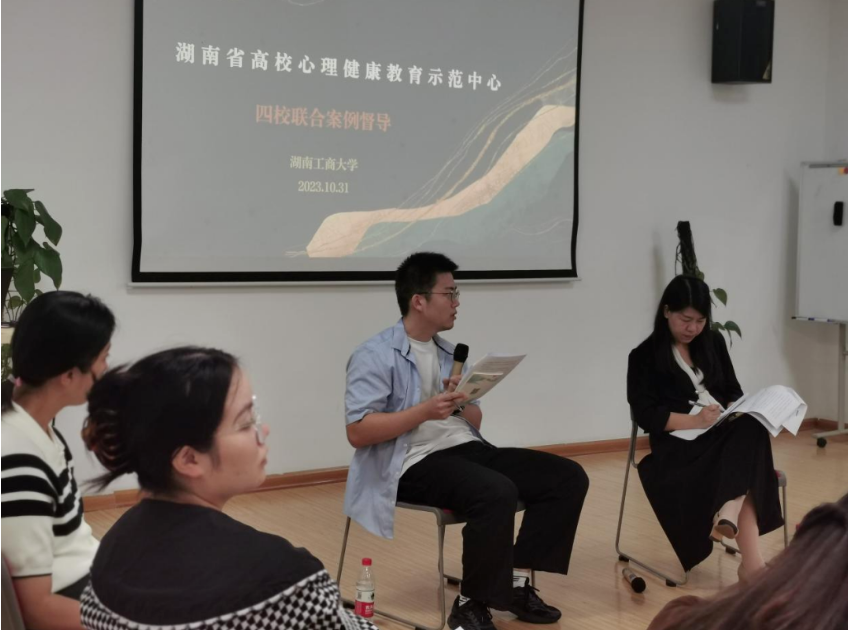 2023年10月31日下午,湖南省心理健康教育示范中心四校联合督导在湖南工商大学南校区心理健康教育中心108团体辅导室举行。本次督导邀请到湘潭大学心理健康教育与咨询中心副教授、中国心理学会注册心理师、湖南省高校心理咨询督导点实习督导师、湘潭市心理学会理事、湘潭市公安局民警心理健康服务工作督导专家、湘潭市心理健康科普专家伍艳老师进行督导,由湖南工商大学中心专职教师蔡子琪老师呈报个案报告。湖南工商大学、湖南信息学院、湖南人文科技学院和湖南电子科技职业学院四校专兼职咨询师参与学习。
