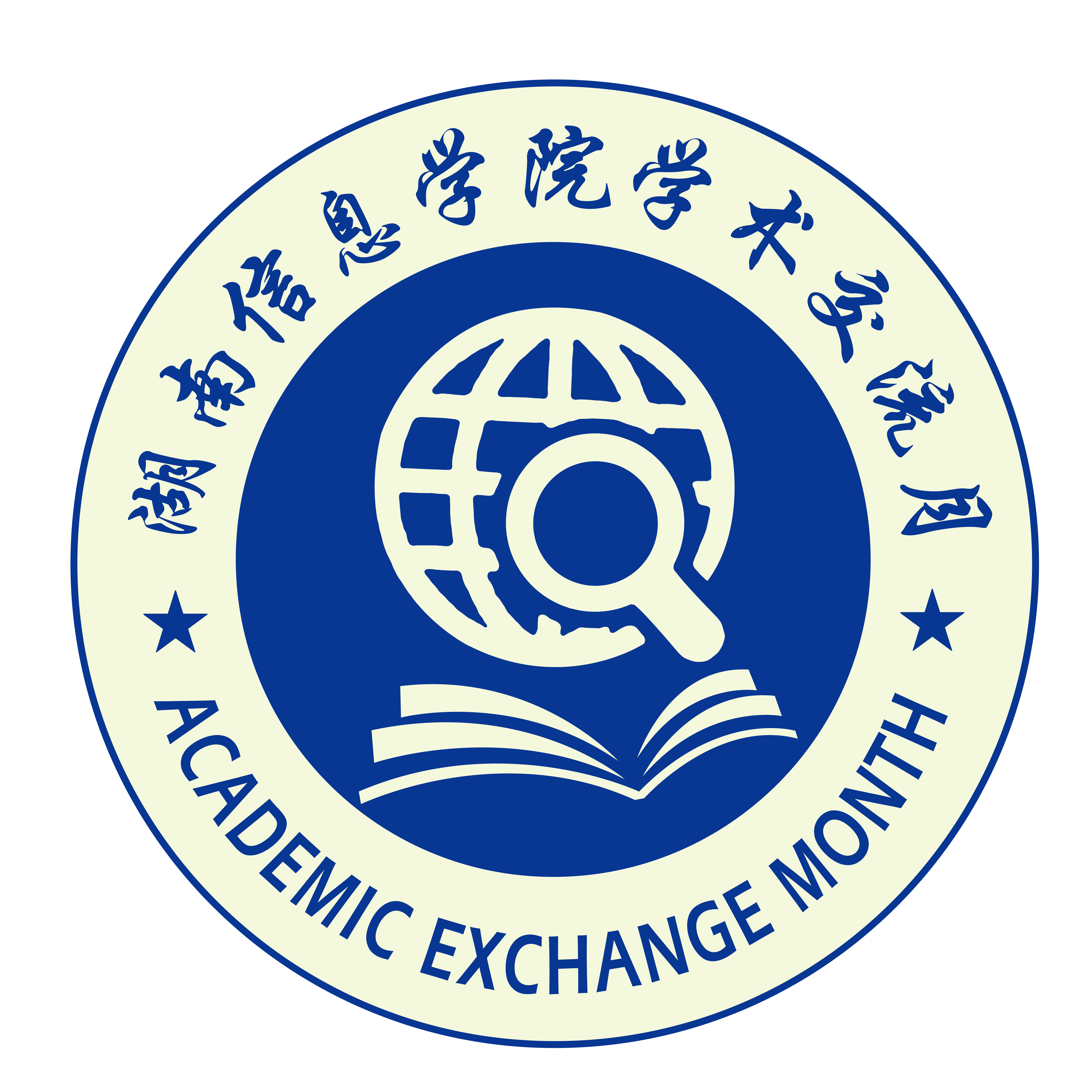 设计说明:颜色采用的是学校校徽中的颜色,对比鲜明,金色代表学校办学成果,蓝色代表在信息时代,学校焕发勃勃生机。经典圆形设计框架,内部写有湖南信息学院学术交流月,表明是属于湘信院的学术交流。主体部分采用一本书上有一个搜索的图标,表明我们要在书本的基础上,在互联网世界进行网上的资源检索、文献检索,然后相互进行学术交流,象征着无止境的学术研究不断探索。