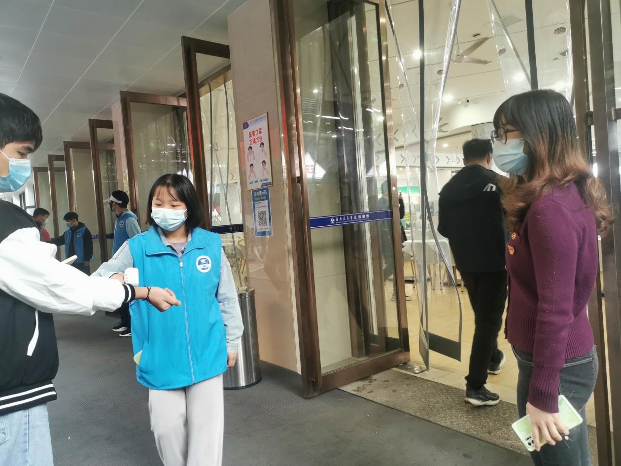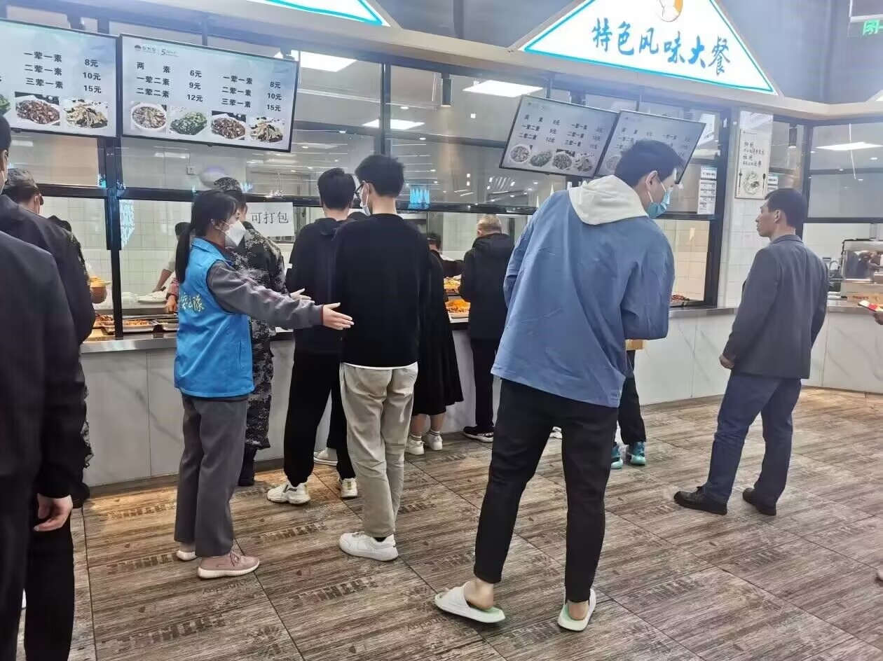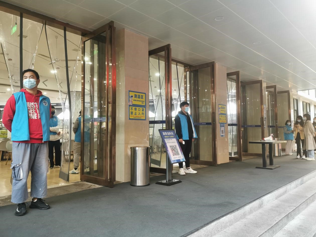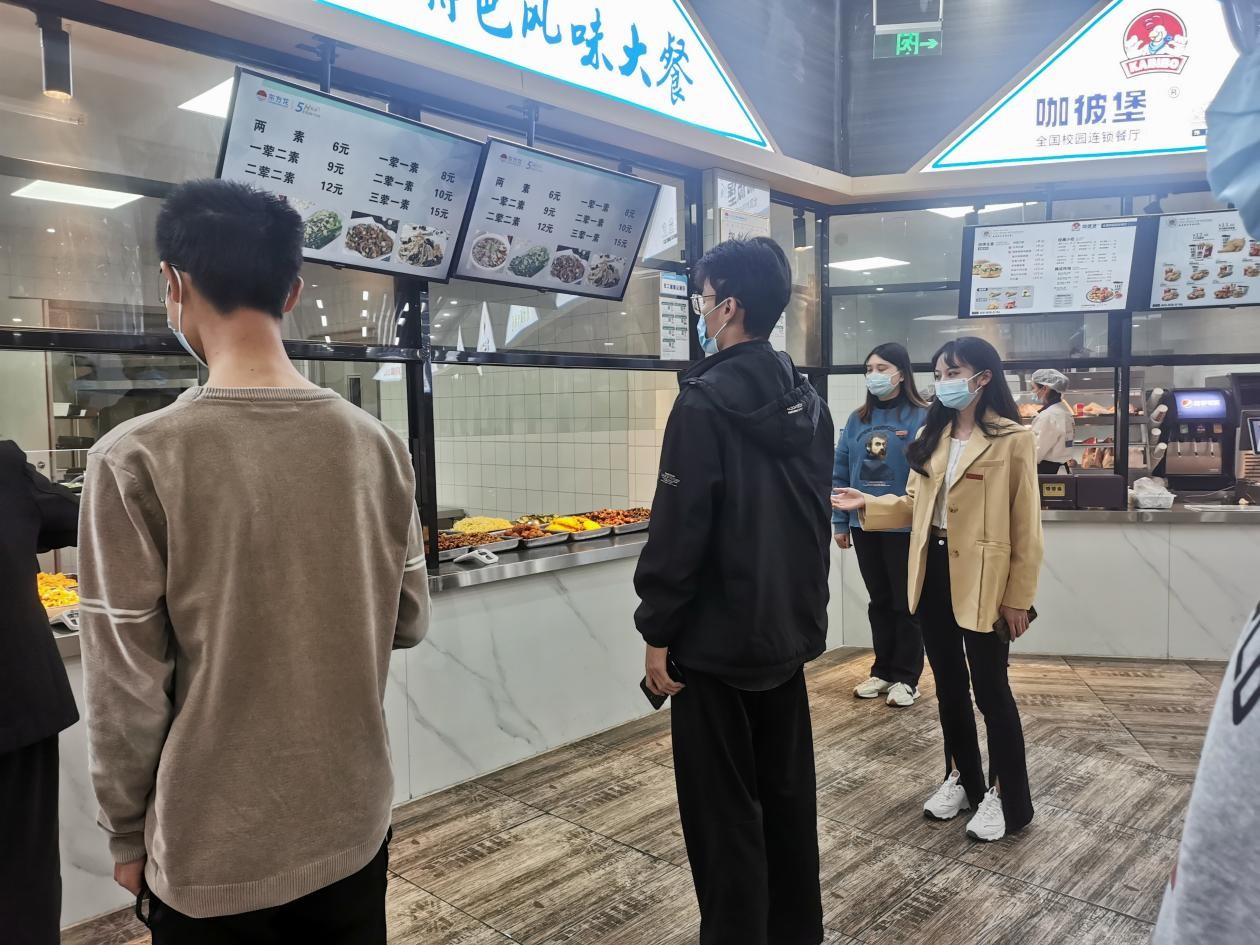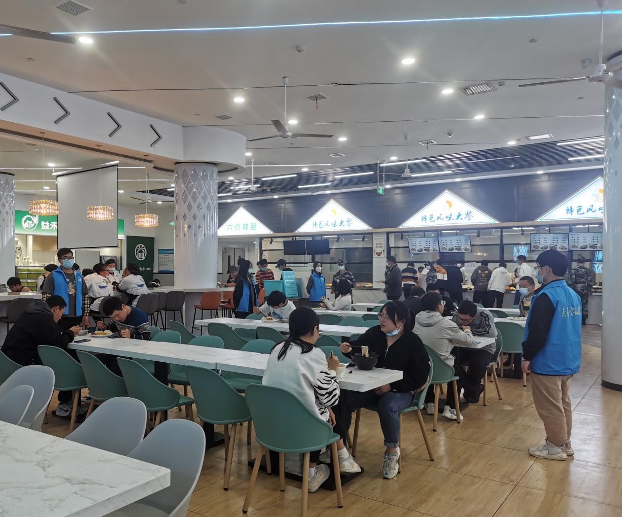 活动期间,在食堂门口的志愿者们引导前来就餐的同学们戴好口罩,有序扫场所码、测温后进入食堂,严格控制食堂内的人数,并及时疏散拥挤人群;在食堂内的志愿者们则时刻提醒同学们“戴口罩,一米距,排好队,快就餐,立回寝”,有效地避免了食堂出现拥挤的情况。志愿者们有序分工,每一个人都坚守在自己的岗位上,为同学们的安全就餐提供了坚实保障。