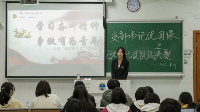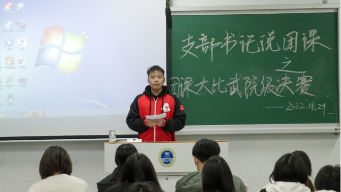 为迎接党的二十大胜利召开,我校为深入学习贯彻习近平新时代中国特色社会主义思想,深刻领会习近平总书记在二十大会上的重要讲话精神,增强团干部素质和团员归属感,强化广大团员青年的政治品格,规范落实团支部“三会两制一课”,提升团支部组织力,强化团支部政治功能,赓续红色血脉,夯实精神之本、熔铸精神之源,计算机科学与工程学院于2022年11月29日下午19:00至20:30在致用楼105开展了第七届院级“支部书记说团课之团课大比武”决赛,本次比赛邀请了江梦娇,唐玉平老师担任评委。