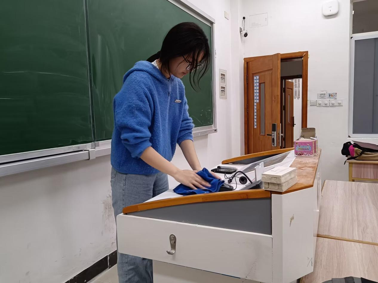 以劳树德、以劳增智、以劳健体、以劳育人,德智体美劳全面发展的教育理念是素质教育体系的价值基础,也是培养人全面发展的的基础。人员到齐后,劳动委员范张毅合理划分了卫生任务,分配好充足的劳动工具,打扫教室卫生活动开始有序进行。桌面擦拭,垃圾清理,清洁窗户,清洁电风扇,清扫、拖拭地板等,大家热情满满,各自奔波忙碌,又相互配合,工作效率高,大家劳动的幸福感和成就感也油然而生。劳动是一种能力,也是一种精神,全体班委能够做到以劳动引导自身,通过劳动努力实现自我价值,在辅导员傅倩楠老师引领下,树立正确的劳动观念和劳动态度,用实际行动践行新时代的劳动精神。