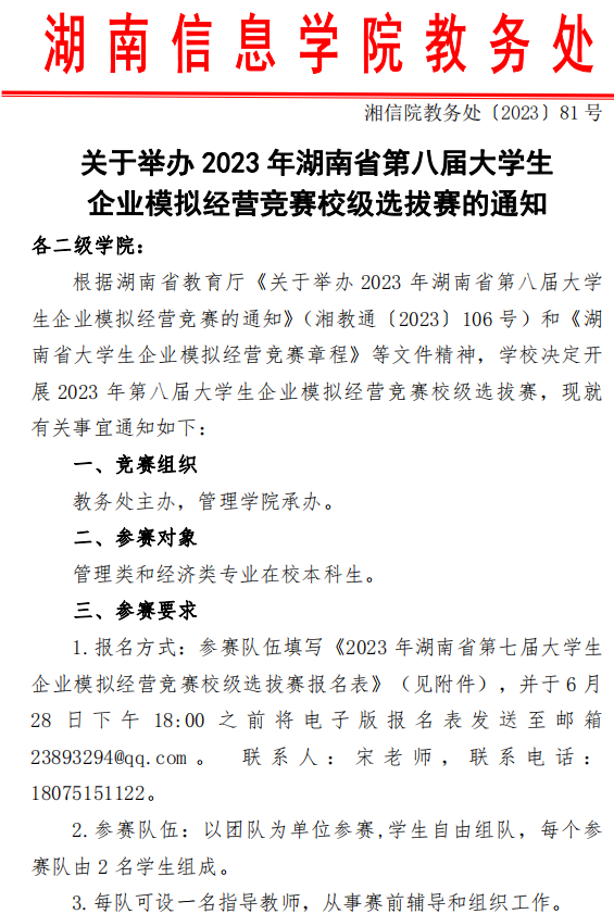 湘信院教务处〔2023〕81号:关于举办2023年湖南省第八届大学生企业模拟经营竞赛校级选拔赛的通知.pdf