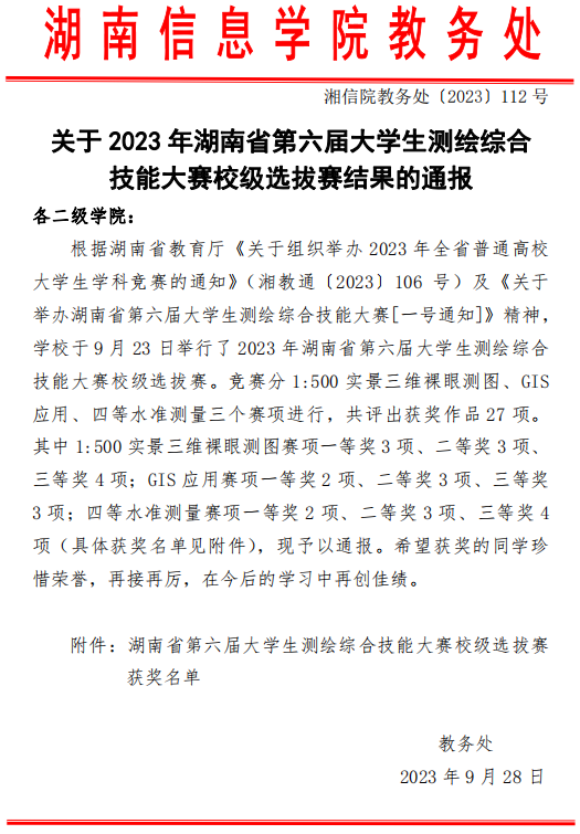 附件:2023年湖南省第六届大学生测绘综合技能大赛校级选拔赛获奖名单.docx
