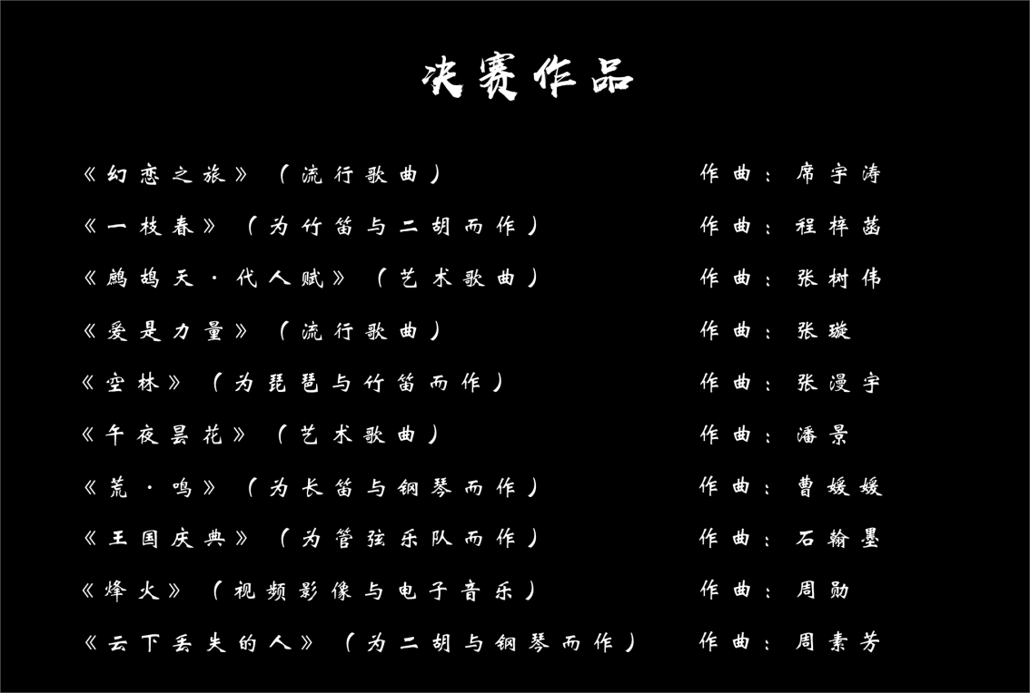 此次作曲比赛由甘梦迪、冯亚晴、汤宁娜、肖筱舟四位老师担任指导老师,韦雨希、金铭两位老师担任艺术指导,特邀嘉宾郭翔、邓朦梦两位老师与音乐表演系部分学生参演此次比赛。共十首优秀作品入选此次决赛,风格各异的原创音乐作品,让听众在作品中感悟其蕴含的情感。