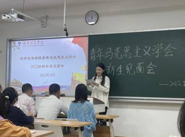 首先,会议在全体学员齐声高唱《国际歌》中拉开序幕,学会会长米美芝同学对各位新会员的到来表示欢迎。随后,李翠老师就学会的发展概况作了简要介绍,特别希望新老成员能继续发扬读原著、学原文、悟原理的优良传统,共同将学会各项活动做新做实。会上,学会骨干还通过短视频和宣读《湖南信息学院青年马克思主义学会章程》,增进了学员们对学会的理解,并且通过新老成员的自我介绍,表达了对学会的认识、憧憬与期待。