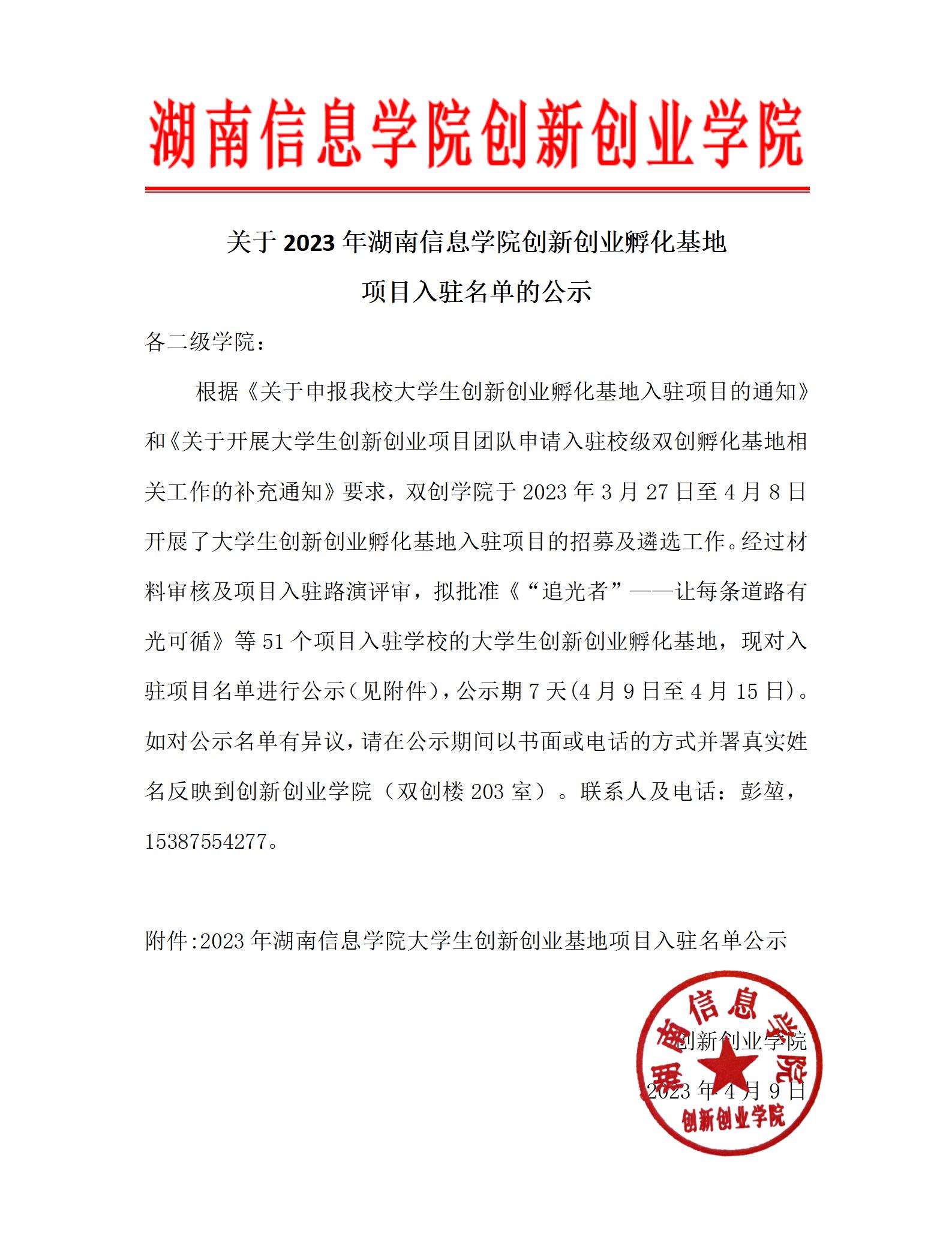 2023年湖南信息学院大学生创新创业基地项目入驻名单公示.pdf