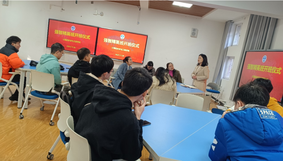 我院于2023年11月28日10:00在致用楼206智慧教室举行第三届“强智精英班”开班仪式,湖南强智科技有限公司CEO刘花果、人力资源中心主任康娜,计算机科学与工程学院院长胡继荣、副院长龚芝、软件工程系主任李跃飞及本届精英班2020级软件工程专业26名学员参加本次会议。会议由学院副院长龚芝主持。