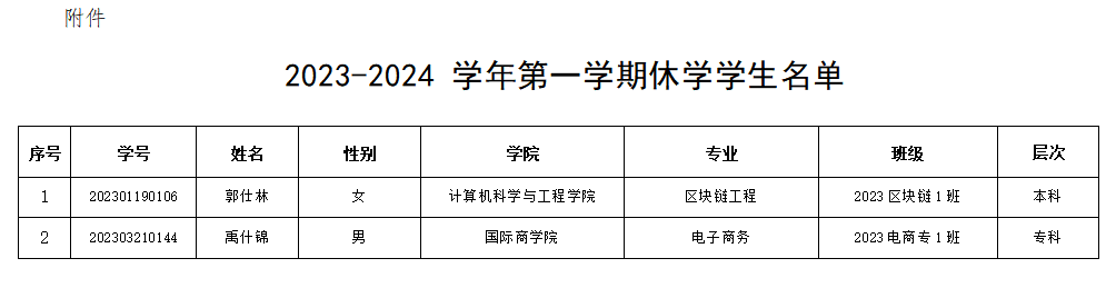 依据《湖南信息学院学生学籍管理规定》以及《湖南信息学院学生休(复)学管理办法》文件精神,经学生本人申请,学校审核,同意郭仕林等2名学生休学,具体名单详见附件。