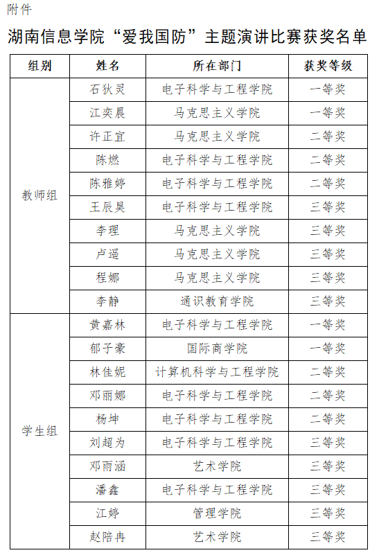 附件:湖南信息学院“爱我国防”主题演讲比赛获奖名单