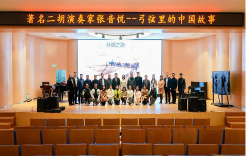 张音悦以中国民族乐器——二胡,诉说弓弦里的中国故事。PPT课件简明扼要、图文并茂,张音悦清晰讲述,且现场以颇具感染力的精湛演奏,独奏与齐奏了多部作品。从二胡的开山祖师——刘天华经典曲目,到代表性的移植作品——《洪湖人民的心愿》(扬琴伴奏),再到疆域风情的《阳光照耀着塔什库尔干》(钢琴伴奏),张音悦的琴声带领听众游梭于中华大地。讲座后半场,张音悦邀请学院师生与二胡爱好者们齐奏《喜送公粮》,现场气氛高涨热烈,观众津津有味,纷纷拍摄记录。最后,张音悦邀请蔡建和等五位德高望重的老领导、学院部分师生合奏《赛马》,把讲座推向了高潮。现场响起经久不息的掌声。