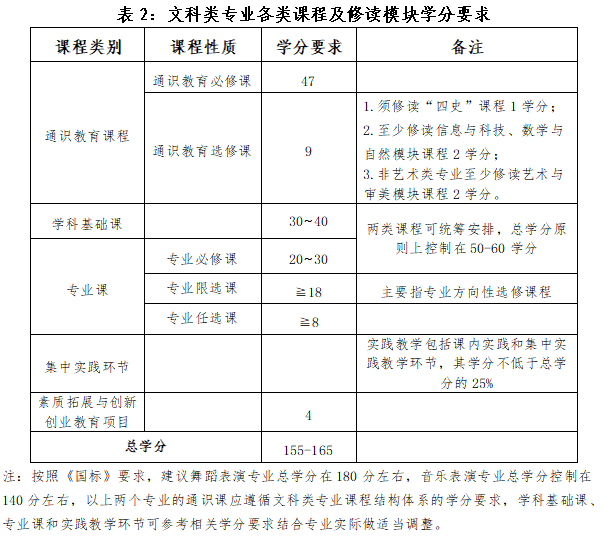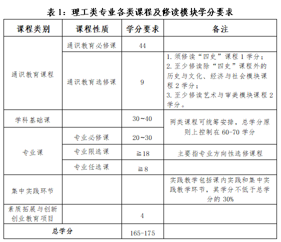 各专业依据培养目标,基于“OBE”理念,建立通识教育课、学科基础课、专业课、集中实践教学环节、素质拓展与创新创业教育项目“五位一体”的课程体系,实行因材施教。学校理工类专业毕业总学分数控制在165-175学分,文科类专业毕业总学分数控制在155-165学分。学分要求与《国标》不一致的,以《国标》为准。学校各专业课程结构及学分要求参见表1和表2。