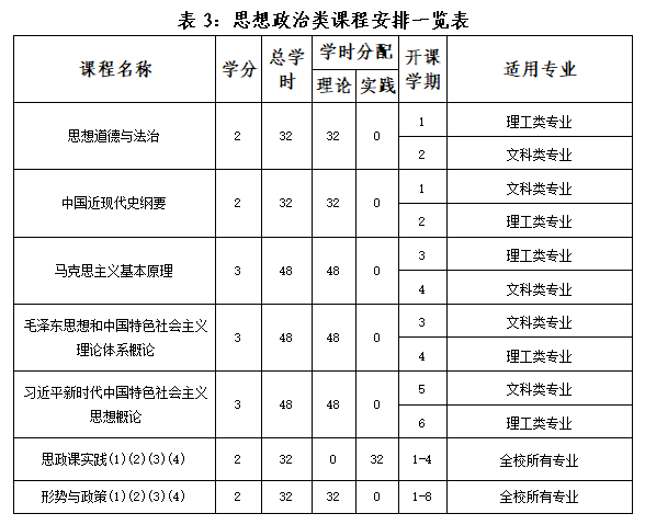 思想政治类课程严格按照《中共中央宣传部 教育部关于印发<新时代学校思想政治理论课改革创新实施方案》的通知》(教材〔2020〕6号)等规定执行。《形势与政策》课程以“线上+线下”的形式进行,每学期不少于8学时,“线下”以讲座形式集中授课,分别于第二、四、六、七学期开设;第一、三、五、八学期进行“线上学习”,共计2学分,“线上学习”不计入总学时;课程每学期考核一次,8个学期的平均成绩作为本课程成绩。