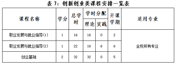 创新创业类课程包括《创业基础》《职业发展与就业指导》。全校各专业在第二和第六学期开设《职业发展与就业指导》课程,共38学时,计2学分;第5学期开设《创业基础》课程,共32学时,计2学分。