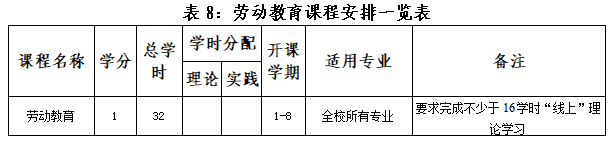 全校所有专业开设“劳动教育”课,纳入集中实践教学环节,计1学分。由学工处牵头每学年开设一次“劳动教育周”活动(四年不断线),以听劳模(技能专家)讲座、学生志愿劳动、劳动技能竞赛、创新创业实践等方式开展劳动实践;同时,马克思主义学院应将马克思主义劳动观融入思政课教学,组织学生完成《劳动教育理论》(不少于16学时线上课程)的学习与考核,深刻把握劳动教育的内在要求,理解马克思主义劳动观, 把握劳动精神、劳模精神、工匠精神、奋斗精神的实质和内涵。
