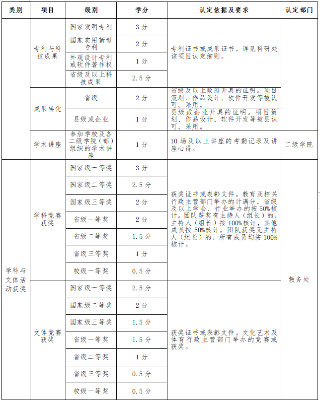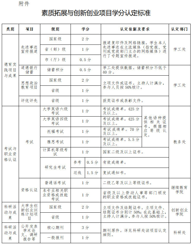 (一)素拓与双创学分分别由教务处、学工处、科研处、校团委、图书馆、教育学院等学校指定的认定部门进行认定。