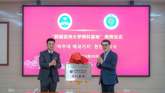 双方对两校产学研建设、专业交叉融合等方面进行了进一步的探讨与沟通,对相关合作领域、合作方式及合作可能性初步交换了意见,并签署合作备忘录(MOU),张福利与李硕远共同为“韩国亚洲大学预科基地”揭牌。