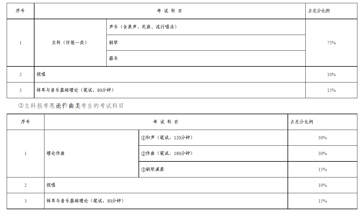 音乐类专业考试成绩总分为300分,具体考试科目根据主科所报类别的不同,分为两种类型: