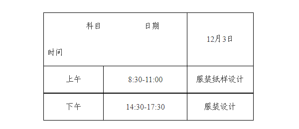 考试所需绘画工具、剪裁工具等自备。服装工艺考试具体时间、地点详细安排由考点另行公布,服装纸样设计、服装设计考试时间统一安排如下: