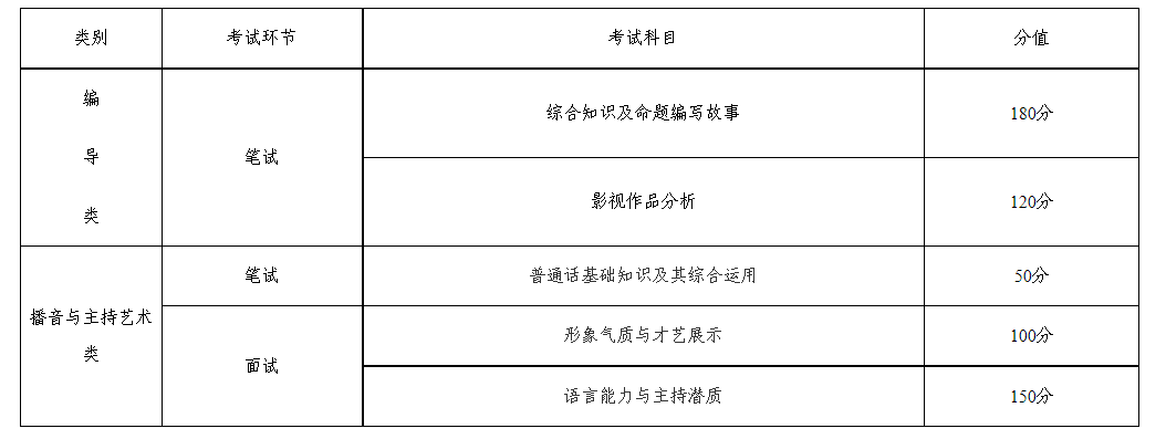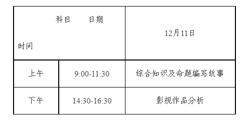 考试时间统一安排在2022年12月11日,考生须在考试前3天开始登录“报名缴费指定系统”打印《专业考试证》,10日下午18时-19时期间考生须前往考试地点熟悉笔试考点,查看考室分布示意图、考试注意事项和各项规定,但不能进入考试大楼和警戒线以内。“综合知识及命题编写故事”科目开考15分钟(11日上午9∶15)后,考生不得进入考室;“影视作品分析”科目开考前15分钟(11日下午14∶15)后,考生不得进入考室。考生必须凭第二代居民身份证以及《专业考试证》在规定的时间和地点参加专业考试。其中笔试时间统一安排如下: