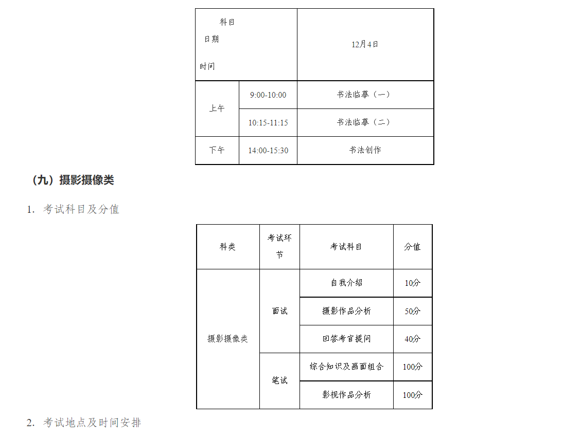 考生必须凭第二代居民身份证以及《专业考试证》在规定的时间和地点参加专业考试。考试时间安排:①面试考试时间采用电脑随机编排。②笔试时间统一安排在12月10日上午9∶30-11∶30(综合知识及画面组合),下午14∶30-16∶30(影视作品分析);“综合知识及画面组合”科目开考15分钟(10日上午9∶45)后,考生不得进入考室;“影视作品分析”科目开考前15分钟(10日下午14∶15)后,考生不得进入考室。考生须在12月9日下午17时-18时期间前往考试地点熟悉笔试考点,查看考室分布示意图、考试注意事项和各项规定,但不能进入考试大楼和警戒线以内。