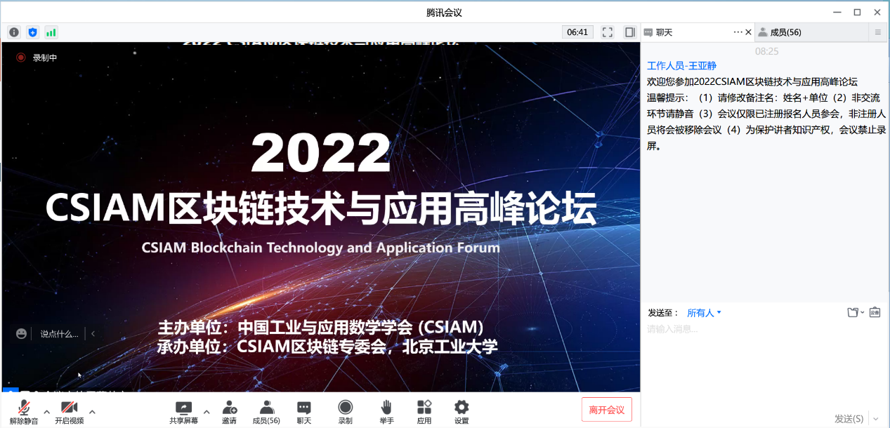 2022年5月14日-15日,由中国工业与应用数学学会(CSIAM)主办,CSIAM区块链专业委员会、北京工业大学承办,北京大学前沿计算研究中心支持的2022中国工业与应用数学学会区块链技术与应用高峰论坛在线成功举办。