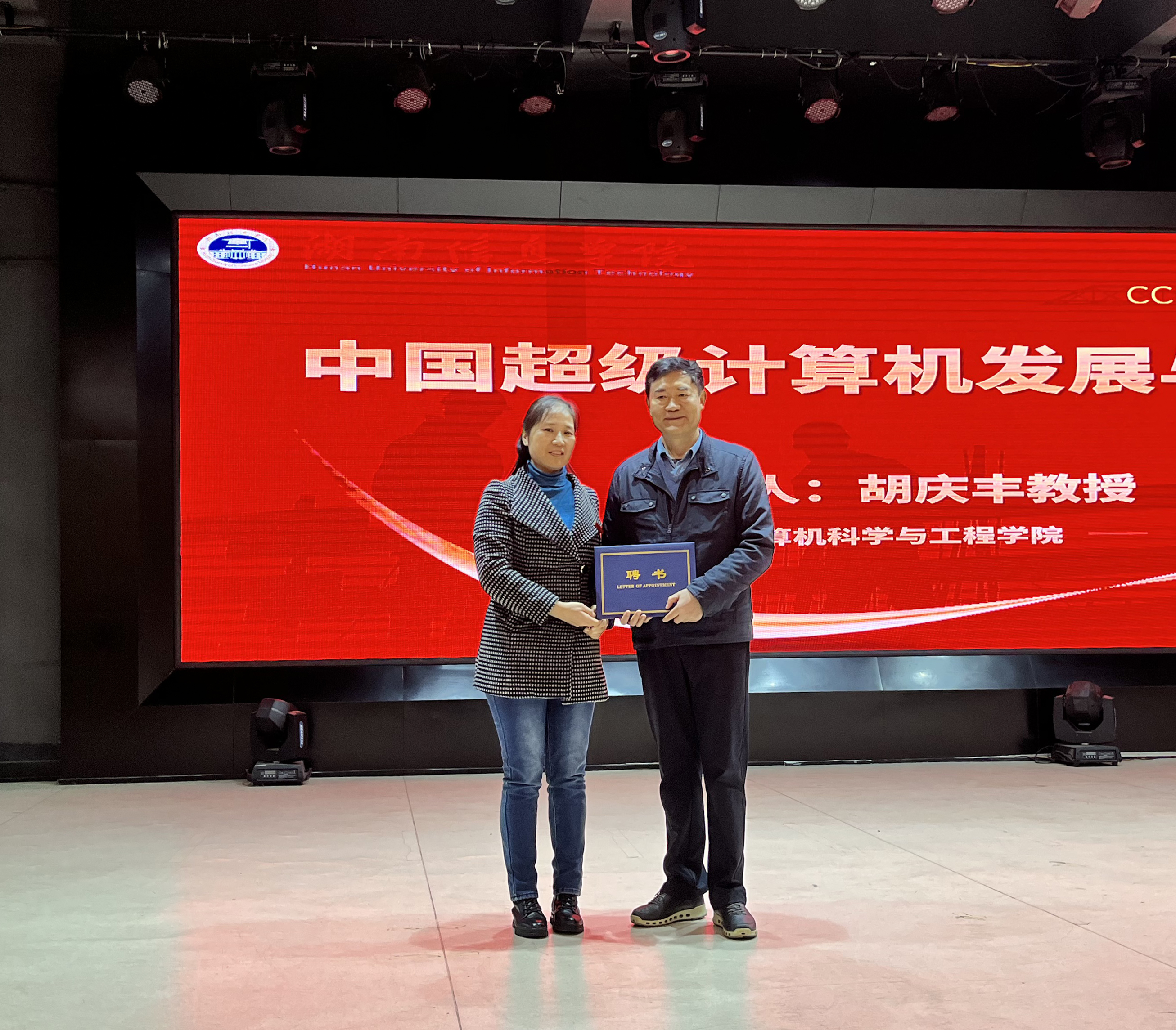 讲座开展前,龚芝副院长为大家简要介绍了胡庆丰教授的履历。胡教授是国防科技大学计算机学院教授,兼任国家超级计算长沙中心常务副主任,同时也是国务院政府特殊津贴专家、国家重点研发计划项目首席科学家、天河系列超级计算机副总设计师兼副总质量师。荣获国家科技进步特等奖1项、一等奖3项、军队和省部级科技进步一、二等奖10余项,对于计算机的发展有着深厚研究。随后,由学院院长胡继荣为胡庆丰教授颁发了专家聘书。
