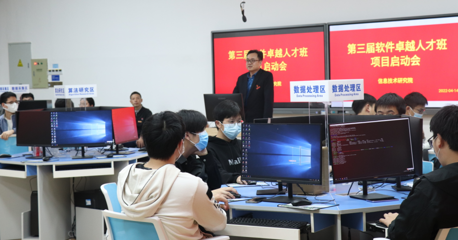 2022年4月14日晚,信息技术研究院组织第三届软件卓越班学员召开信息技术实战项目启动会。计算机科学与工程学院党总支书记史珺宇、计算机科学与工程学院副院长陈敏、信息技术研究院副院长刘胜楠和研究院导师以及学院近100余人参加此次会议。