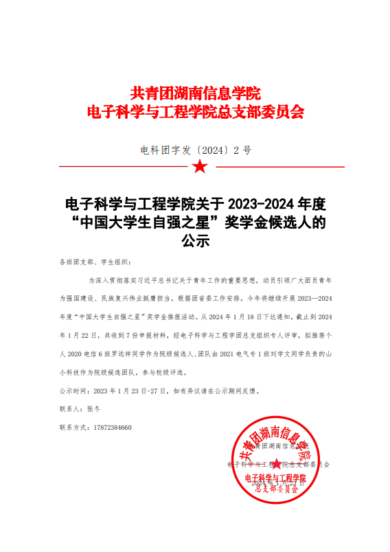 电子科学与工程学院关于2023-2024年度“中国大学生自强之星”奖学金候选人的公示