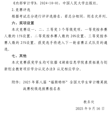 附件:湘信院教务处〔2025〕167号:关于开展2025年第八届“福斯特杯”全国大学生审计精英挑战赛校级选拔赛的通知.zip