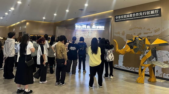 湖南高桥大市场作为全国第二大综合性、中国内外贸结合示范市场,是中国(湖南)自由贸易试验区长沙片区的重要组成部分,承载了中国(湖南)自由展易试验区、中非经贸深度合作先行区(核心区)、中非经贸博商公常治展馆,市场采购贸易方式试点以及国家进口贸易促进创新示范区等五大平台试点任务,积极推动国际、国内双循环发展。本次活动中,2023级学生先后参观了中非经贸示范合作园区和湖南出口产品集聚区。经企业导师详细介绍和耐心讲解,同学们认识了中非经贸博览会、中国湖南自由贸易试验区、中非经贸深度合作先行区规划、两会一载体,了解到在实现“三高四新”美好蓝图中湖南的新发展。基于融合湖南自贸试验和中非经贸深度合作的区域特色优势,高桥大市场打造的湘品出海、非品入湘的独立创新自贸板块,使同学们感叹湖湘文化和非洲文化魅力的同时,更明白了国际商务中本专业在跨文化交流中的意义。在参观过程中,企业导师针对同学们提出的“实习板块和实习形式“等问题作出了一一解答。