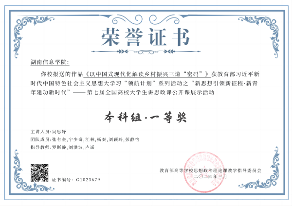 近日,“新思想引领新征程·新青年建功新时代”——第七届全国高校大学生讲思政课公开课展示活动评审结果公布,湖南信息学院选送的作品《以中国式现代化解读乡村振兴三道“密码”》荣获本科组一等奖。