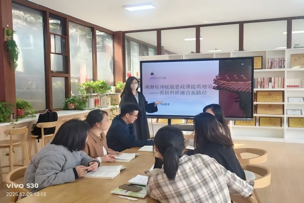 2025年12月9日,马克思主义学院思想道德与法治教研室在励智楼135举办专题科研讲座。由杨菁菁老师以“湖湘精神赋能思政课提质增效——教研科研融合新路径”为题分享研究成果与实践思考,教研室全体教师参与学习交流。