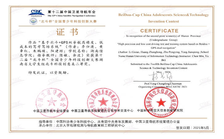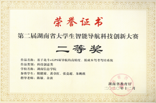 “北斗杯”省级一等奖、智能导航科技创新大赛省级二等奖、“挑战杯”课外学术科技作品竞赛铜奖,软件著作、发明专利共计9项、校级创新创业孵化园入驻、“互联网+”省级三等奖、长沙“银行杯”大学生创新创业大赛校级二等奖