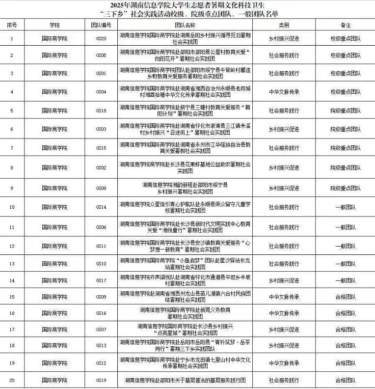 本次汇报评选共有20支实践团队同台展示,队伍类别涵盖乡村振兴促进、社会服务践行、中华文脉传承等多个专项领域 —— 其中乡村振兴促进类7支、社会服务践行类9支、中华文脉传承类4支。各团队依托专业素养与学科优势,深入岳阳、邵阳、湘西、怀化、永州等湖南多地,扎实开展乡村振兴调研、教育关爱服务、留守儿童护航、公益助农实践、传统文化传承、基层普法宣传等特色行动,用脚步丈量国情,用行动践行使命。