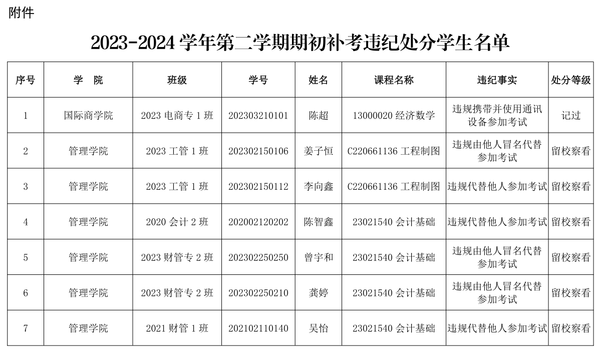 附件:2023-2024 学年第二学期期初补考违纪处分学生名单