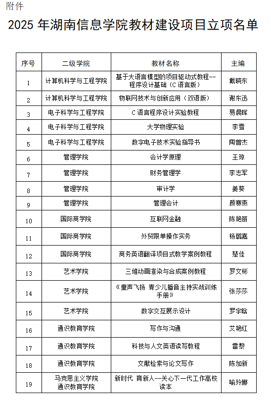 根据《湖南信息学院教材建设与选用管理办法(修订)》和《关于开展2025年教材建设项目立项申报工作的通知》(湘信院教务处〔2024〕209号)文件要求,经个人申报、学院推荐、教务处审核、学校教材工作委员会评审等程序,决定立项《基于大语言模型的项目驱动式教程--程序设计基础(C语言版)》等19个教材建设项目(名单详见附件),现将相关事宜通知如下: