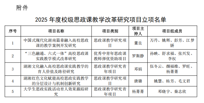 根据湖南省教育厅《关于申报 2025 年度湖南省高校思政 课教学改革研究项目的通知》精神及学校要求,由项目负责人申请,马克思主义学院组织专家评审,教务处审核,学校批准立项 5 个项目为 2025 年度校级思政课教学改革研究项目,现予以公布(详见附件)。