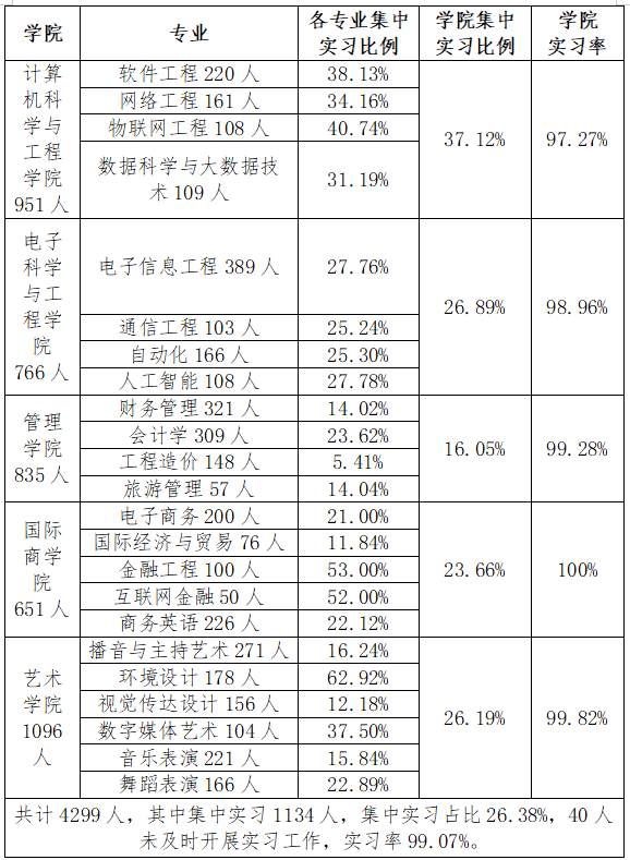 2024届本科毕业实习学生4299人,其中计算机科学与工程学院951人、电子科学与工程学院766人、管理学院835人、国际商学院651人、艺术学院1096人。各二级学院基本能按要求落实学生毕业实习工作相关要求,认真组织开展毕业实习工作,积极建立校外实习基地,有效保障学生实习岗位数量、实习条件,学生毕业实习岗位与专业基本对口,严格落实实习过程管理,实习审批较规范,实习材料较齐全,指导教师基本做到认真提供专业性指导,基本确保学生实习工作安全有序开展。
