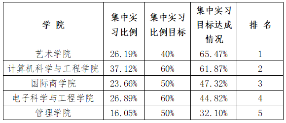 2024届本科毕业生毕业实习组织过程中,环境设计、金融工程、互联网金融等3个专业集中实习比例较高,工程造价、国际经济与贸易、视觉传达设计等3个专业集中实习比例相对较低。根据学校对各学院2024年度集中实习比例要求,对集中实习达成度进行排名,各学院排名如下: