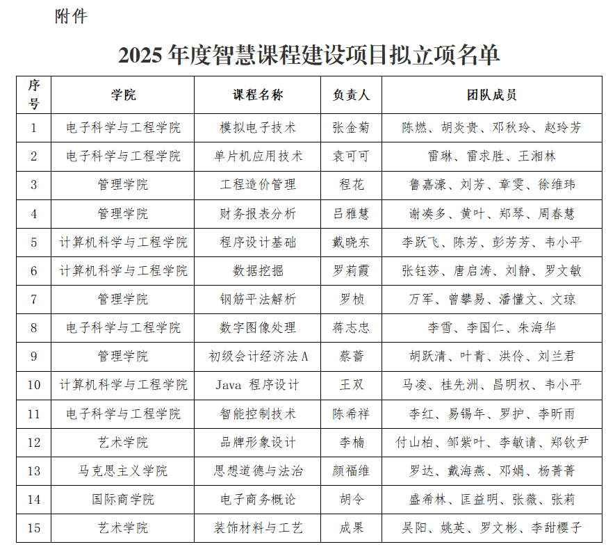 根据《关于开展2025年智慧课程建设项目立项工作的通知》(湘信院教务处〔2025〕110号)要求,由课程团队申请,所在部门遴选推荐,教务处组织专家评审,学校拟立项15门课程为2025年度智慧课程建设项目(名单见附件),现予以公示。