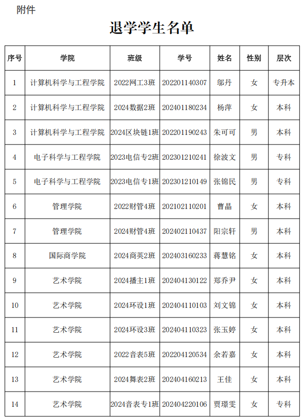 各处室部委(中心)、二级学院、附属单位: 根据《普通高等学校学生管理规定》《湖南信息学院学生 学籍管理规定》文件精神,经学生本人申请,教务处初审,2025 年 3 月 31 日学校校务会研究审定,邬丹等 14 名学生符合退学 相关规定,同意退学(详见附件)。 请各二级学院通知学生及家长,有关部门按规定办理。