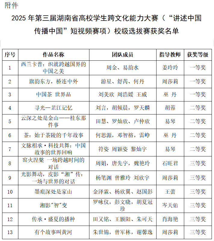 关于2025年第三届湖南省高校学生跨文化能力大赛(“讲述中国 传播中国”短视频赛项)校级选拔赛结果的通报