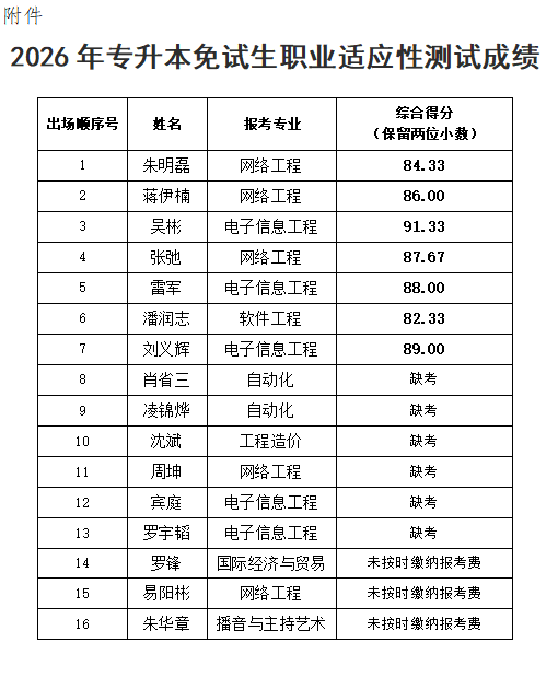 湖南信息学院2026年专升本免试生职业适应性测试成绩公示