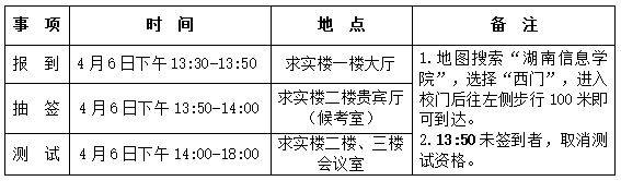 1.考生凭有效身份证原件于2026年4月6日13:30-13:50到湖南信息学院求实楼一楼大厅集合。