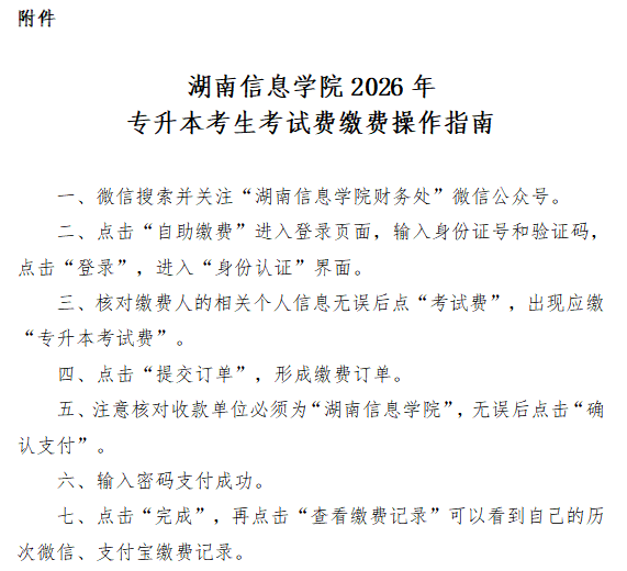 2.缴费时间:考生在2026年4月3日下午5点前完成缴费。未在规定时间内缴费的学生,我校将视为自动放弃报名,不予安排测试。缴费成功后,因考生个人原因导致不能参加考试的,考试费不予退还。具体方式及流程见附件《湖南信息学院2026年专升本考生考试费缴费操作指南》。