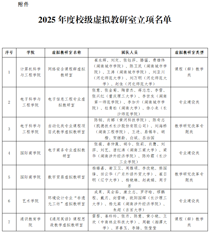 根据《关于开展2025年校级虚拟教研室建设项目立项工作的通知》(湘信院教务处〔2025〕11号)精神,由项目负责人申请,所在部门遴选推荐,教务处组织专家评审,现立项7个校级虚拟教研室(名单详见附件)。